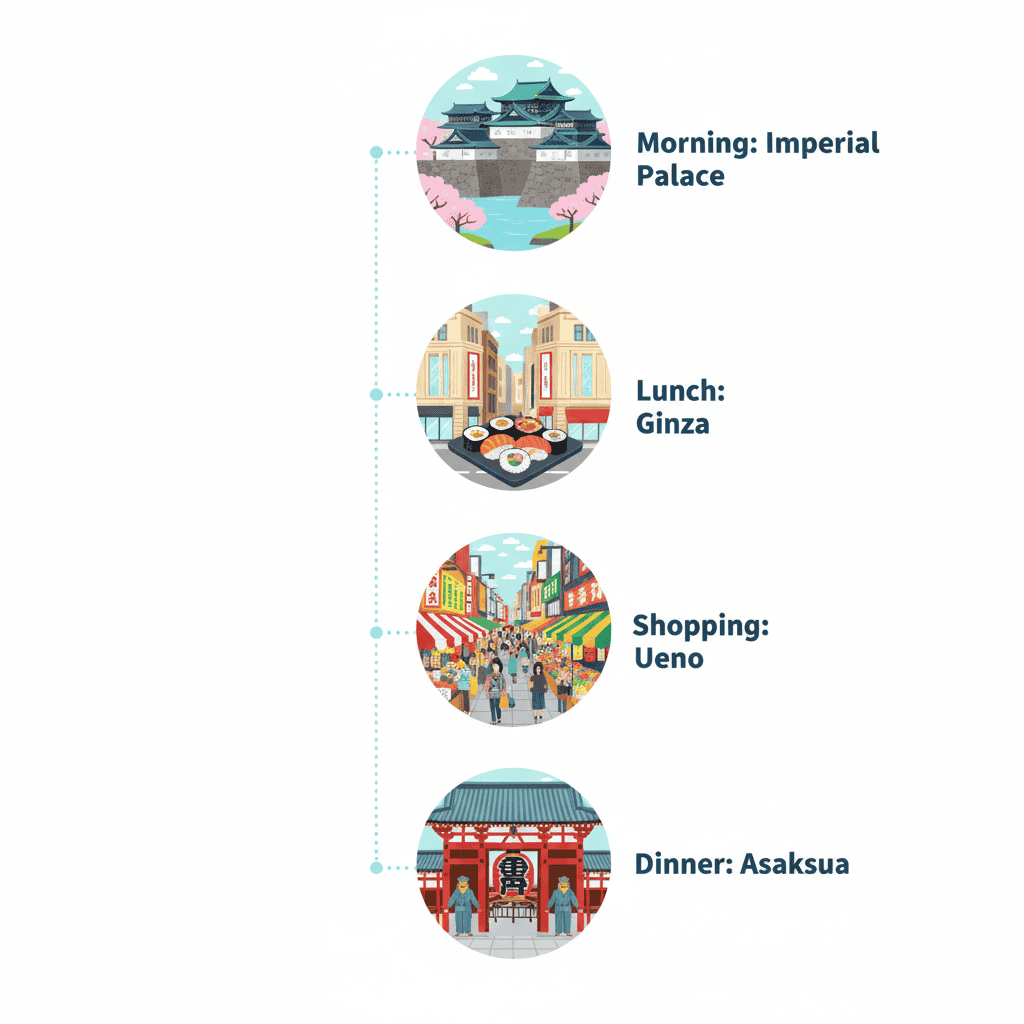 - Start your day at 9:30 AM with what might be the world’s most prestigious morning walk – a loop around the Imperial Palace. This 5-kilometer path, once the perimeter of Edo Castle, now serves as a seamless blend of Japan’s past and present. As you stroll counterclockwise from Tokyo Station’s Exit 6, you’ll find yourself in an unlikely urban oasis where suited executives jog past tourists, all against the backdrop of ancient stone walls and gleaming corporate headquarters.