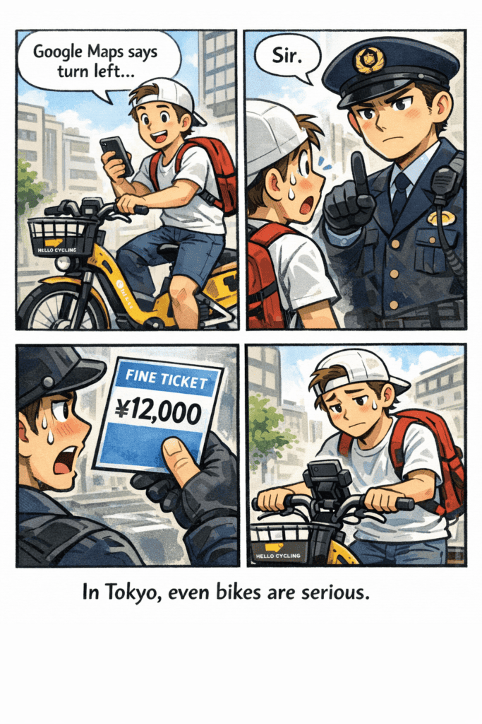 • 🚫 No Smartphones: Holding a phone while riding = Fine up to ¥12,000 (or worse, prosecution). Mount it or stop to check maps.