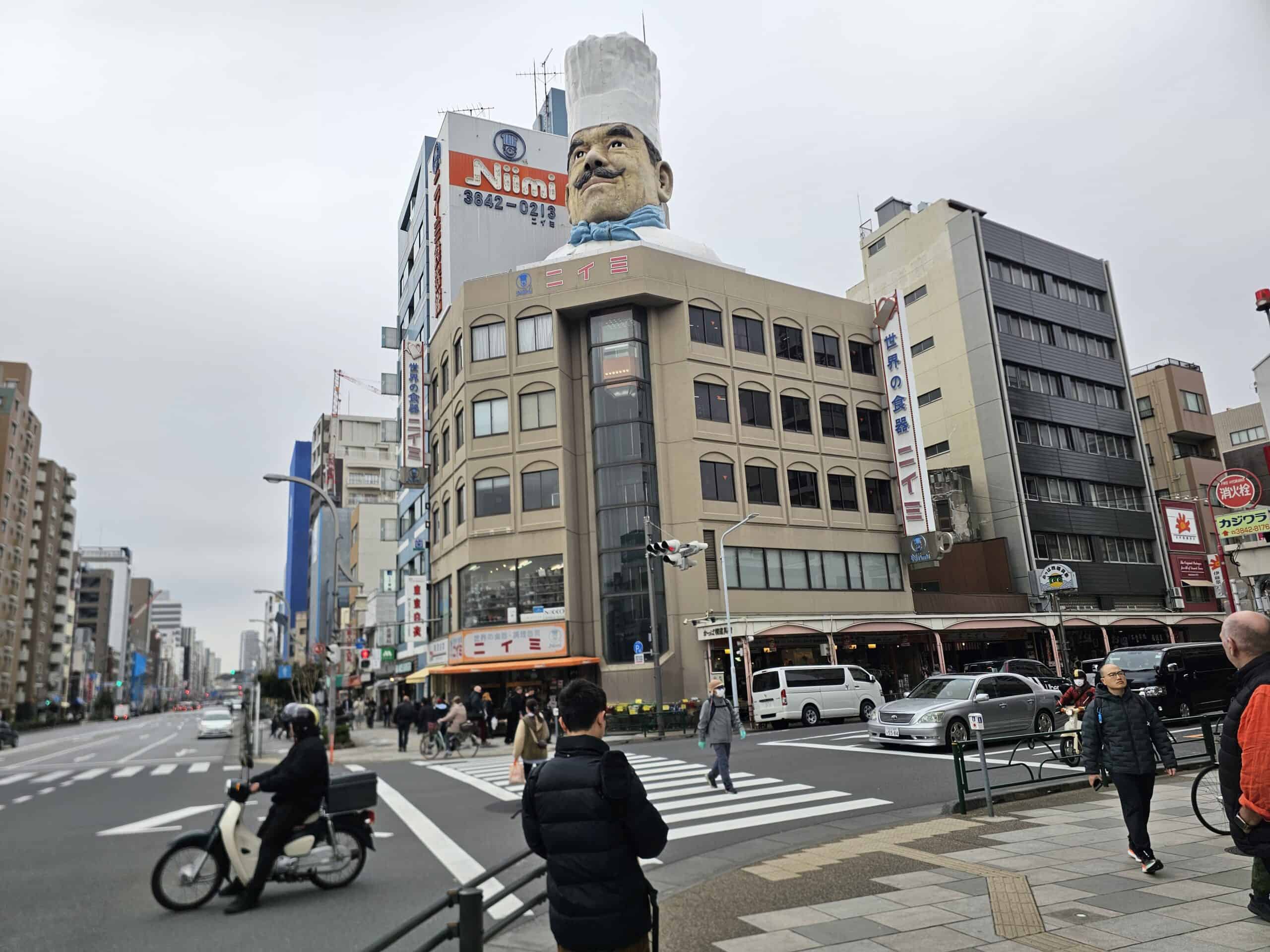 If you look carefully while walking along Kappabashi Street, you may notice that the famous giant chef statue on the Niimi building is not just a decoration.