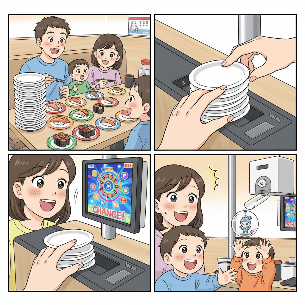 Pro Tip: “Bikkura Pon! Plus” The standard win rate is not guaranteed. However, Kura Sushi recently introduced a “Plus” system. By paying an extra ¥10 per plate, the win rate changes to 1 in 3 games guaranteed. You can select this option on the tablet before you start eating.