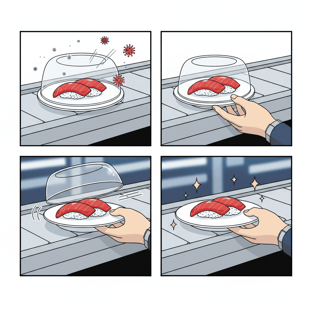 Developed over 10 years and protected by patents, this system was created to protect sushi from airborne bacteria, viruses, and dust. Long before the global pandemic raised hygiene awareness, Kura Sushi was already sealing its food.
