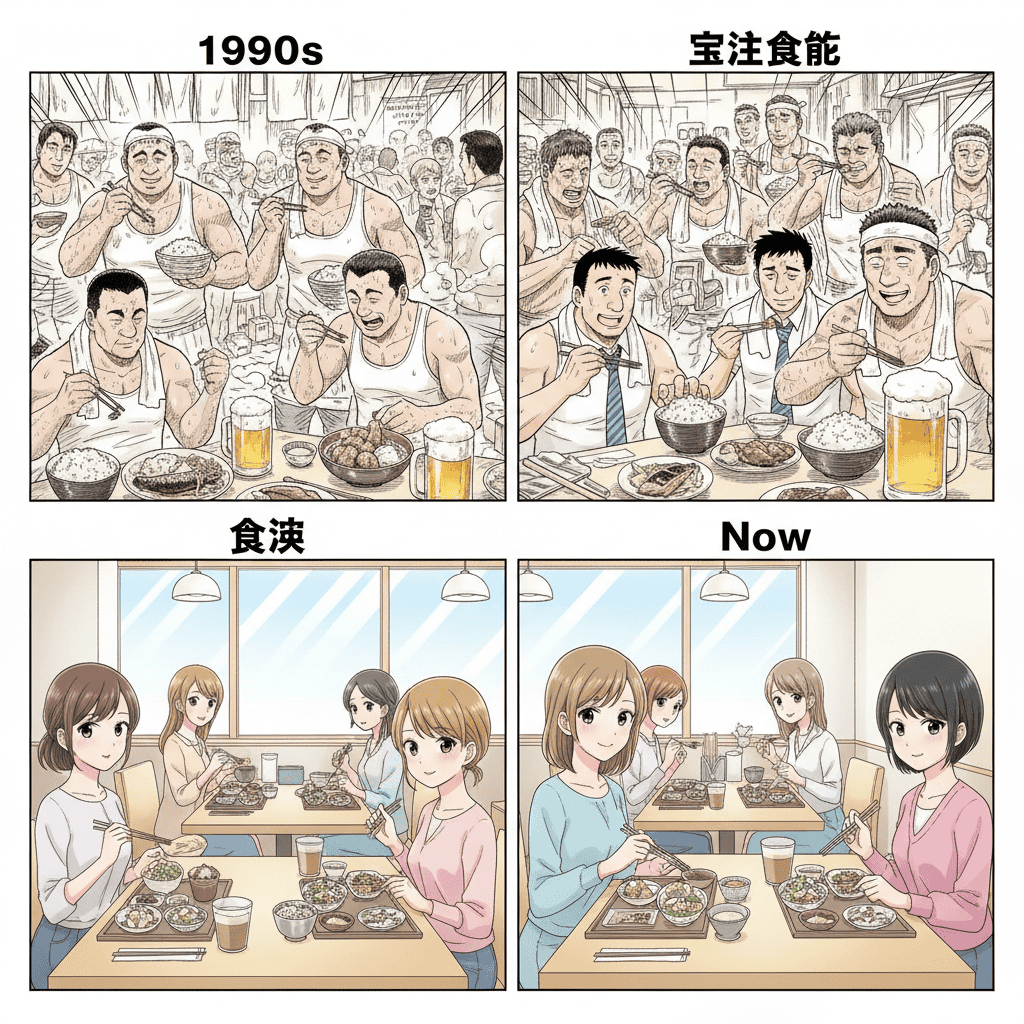 - Kajino’s Eye: In the 20th century, Teishoku shops were male-dominated spaces—men in undershirts sweating while eating. It was a “man’s world.”