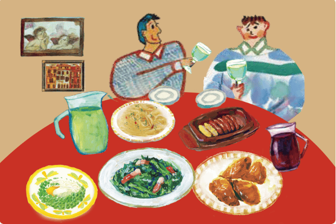 Sample Meal for 2 People – Milan Doria, Carbonara, Salad, Wine (Total: ¥2,000) Image courtesy of Saizeriya Co., Ltd.