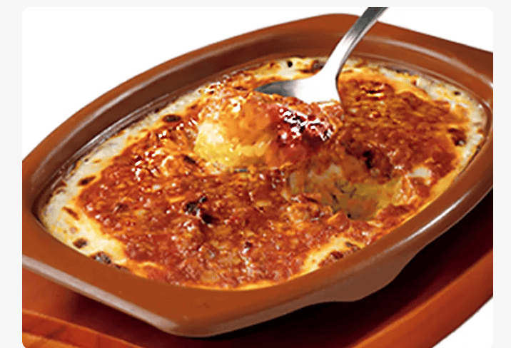 Saizeriya’s #1 most popular dish. A simple yet satisfying baked rice casserole you’ll never tire of. The white sauce is made using a proprietary method that brings out the natural milk flavor, while the meat sauce highlights the umami of beef and vegetables. These two sauces combine with turmeric rice and cheese to create layers of flavor.