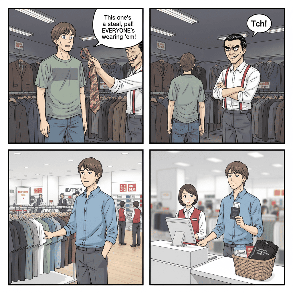 Honestly, I used to hate going to clothing stores in the 90s. Why? Because of the “Customer Harassment” disguised as service. The moment you walked into a shop, a clerk would stick to you like a shadow. They would talk non-stop, pushing sales until you bought something. They believed this was “good salesmanship.” I remember looking for a dress shirt for a suit. When I decided to buy one, the clerk immediately attacked: “How about a tie to go with it?” I refused, saying I had plenty. On the way to the register: “This tie matches perfectly.” I tried to pay, and again: “We have great ties.” I finally snapped and walked out without buying anything. Sometimes, if you left without buying, they would even click their tongues at you (a rude “Tch” sound). That was the norm.