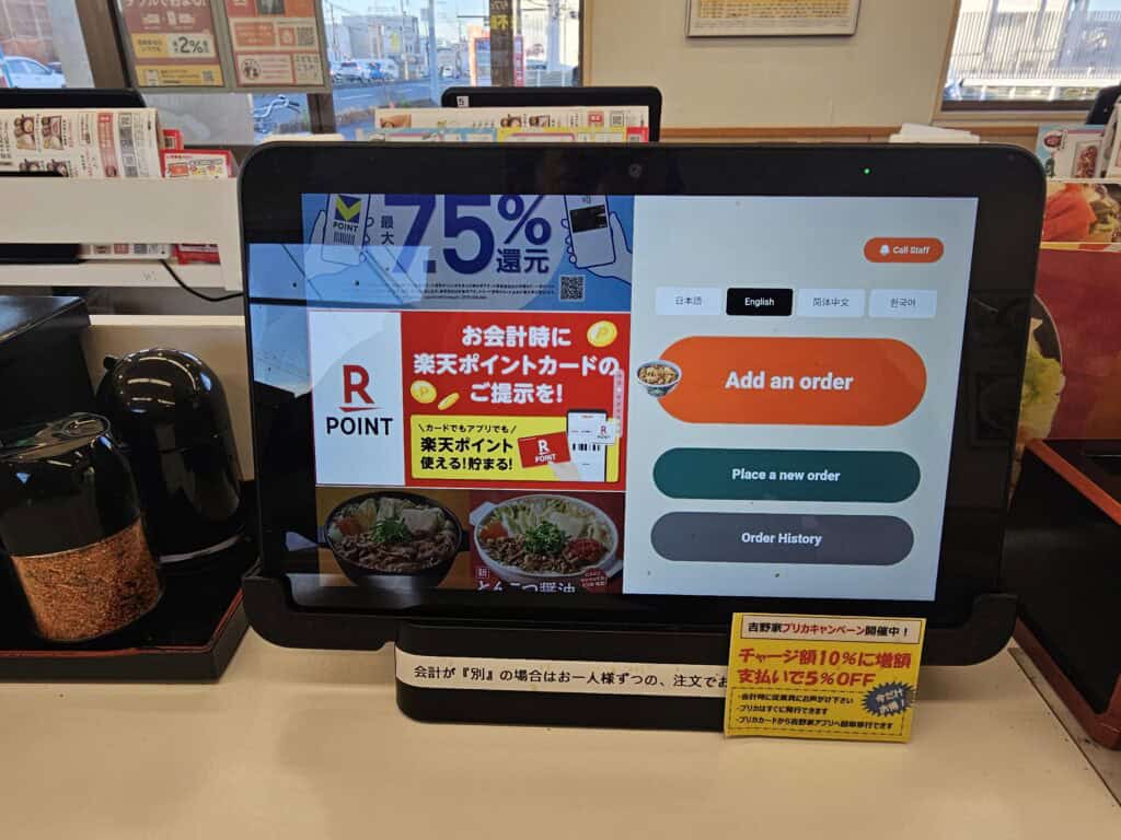 Yoshinoya has introduced tablet ordering systems with English language support. Simply select your items from the tablet at your table. The staff will bring your food along with a bill. After finishing your meal, take the bill to the cashier register to pay. **Alternative Method:** If you find the tablet confusing, you can raise your hand to call a staff member and point to the items on the popular menu list and size chart in this guide. This traditional method still works perfectly.