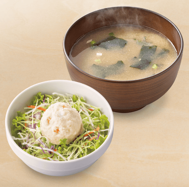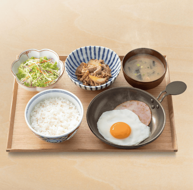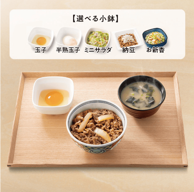 Set meals and lunch services include side dishes and miso soup, but individual bowls (donburi) do not. Yoshinoya offers over 14-15 types of morning set meals (5:00 AM – 11:00 AM), which are cheaper than regular menu items and include unlimited rice refills. Below, we introduce 4 popular all-day side items (¥100-250) you can add to any order, followed by 3 typical morning set options.