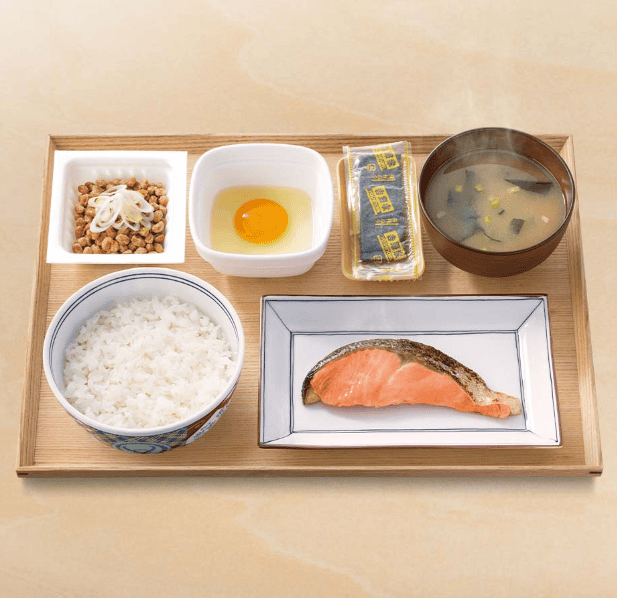 Morning-only service (5:00 AM-11:00 AM) includes health-focused set meals combining grilled fish, natto (fermented soybeans), tofu, eggs (raw or fried), pickles, and salad. Perfect for those avoiding meat.