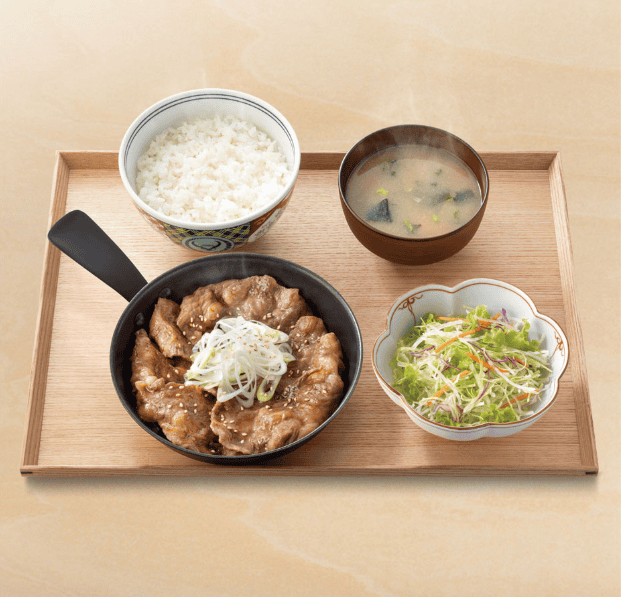Primary offerings include gyudon (beef bowl), beef plate set meals, curry rice, unagi-don (eel bowl), stir-fried pork and beef set meals, healthy breakfast sets, and sukiyaki set meals. In 2025, Yoshinoya experimentally launched beef tsukemen set meals. Unlike competitors Sukiya and Matsuya—which constantly develop new menu items through ongoing scrapping and building—Yoshinoya maintains a conservative approach, rarely expanding its repertoire. The chain introduced affordable breakfast sets in 1982.